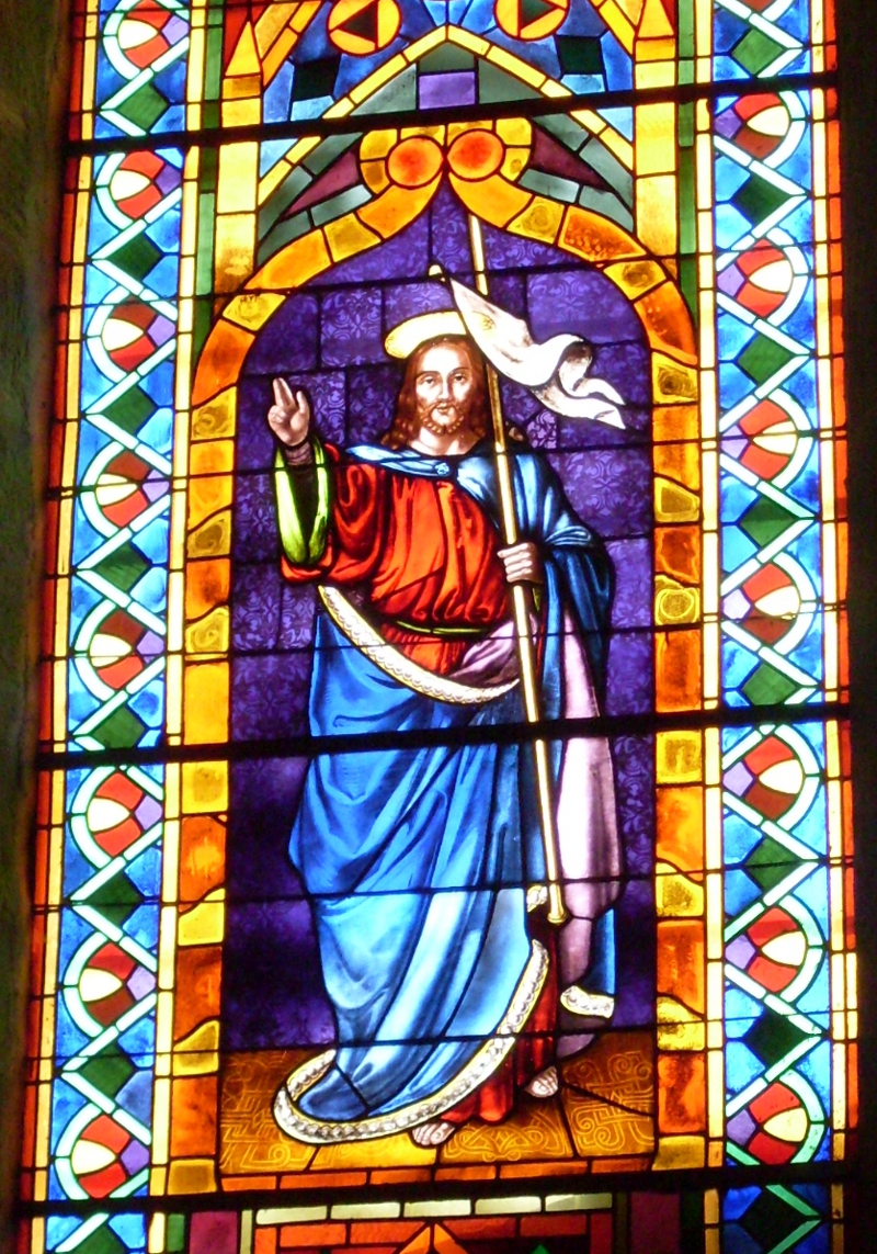 Ce vitrail est situé dans le chœur de l’église. Dans la partie inférieure du vitrail, une banderolle rapelle le message de Jésus-Christ aux apôtres après sa résurection : "Je suis avec vous tous les jours jusqu’à la fin du monde". Voici le texte (fin de l’Évangile selon Saint Mathieu)