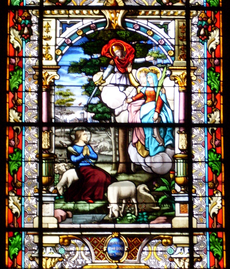 Le vitrail représente la scène fameuse des "Voix" : Jeanne, a treize ans. Elle garde les troupeaux près de son village Domrémy. Elle affirme avoir entendu les voix célestes des saintes Catherine et Marguerite et de l’archange saint Michel lui demandant d’être pieuse, de libérer le royaume de France de l’envahisseur et de conduire le dauphin sur le trône. Après plusieurs années d’hésitations, de murissement, elle prend sa décision. A seize ans, elle se met en route…