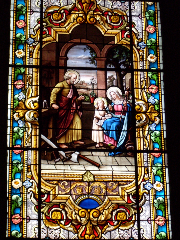 Ce vitrail évoque la Sainte famille : à gauche, Joseph père nourricier de Jésus, avec ses outils de charpentier.