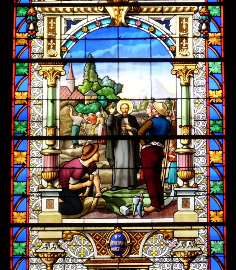 Le vitrail le montre au milieu de ses paroissiens, en plein champ, car il était très proche des gens et de leurs préoccupations.