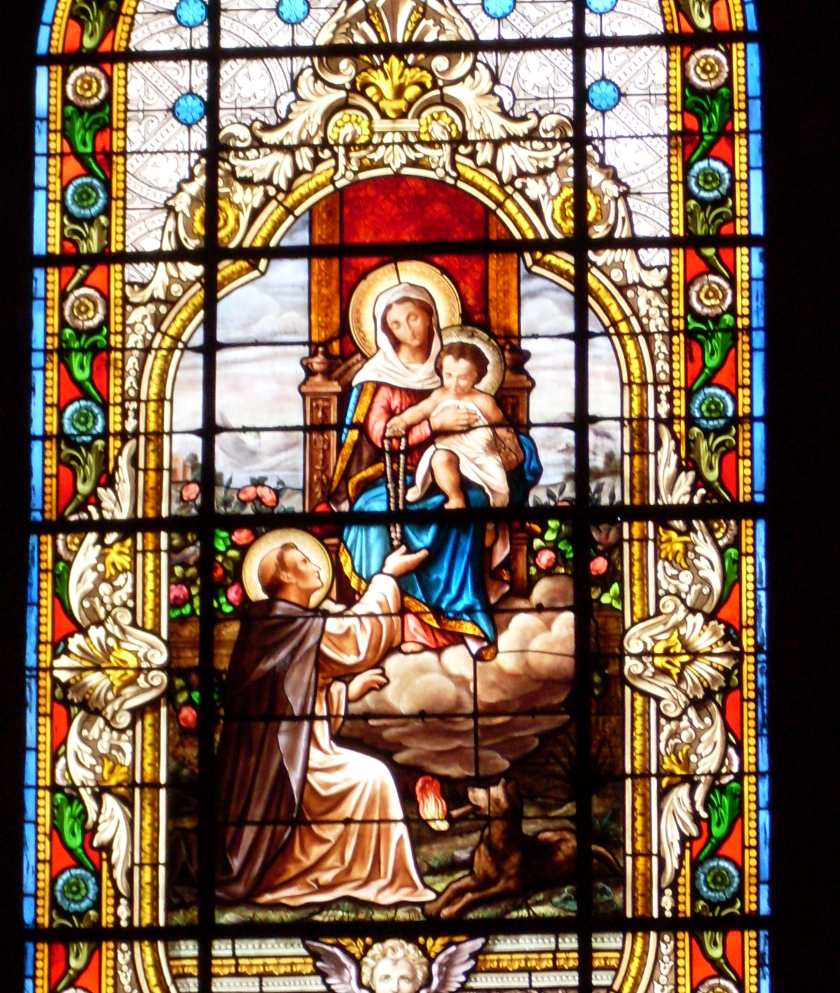 Que ce soit en retable , en vitrail, en statuaire ou en peinture, tout un patrimoine religieux fait état de l’antique tradition de Saint Dominique (1170-1221) recevant le saint Rosaire des mains de la Vierge Marie.