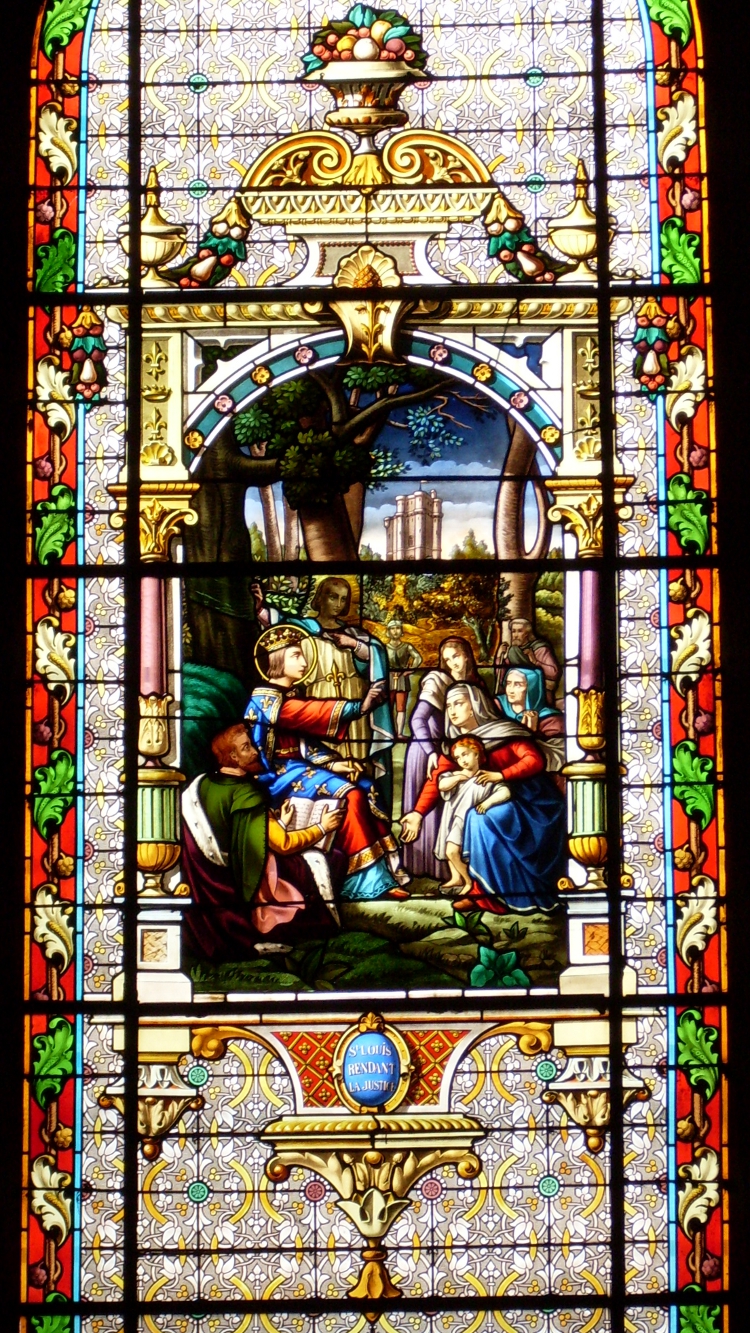 Ce vitrail évoque le roi de France Louis IX qui règna de 1226 à 1270. Il n’avait que 12 ans lorsqu’il fut sacré roi à Reims. Sa mère Blanche de Castille était une mère très attentive et pieuse. Elle donna à son fils une excellente éducation, des principes moraux, et le sens du devoir juste et bon.