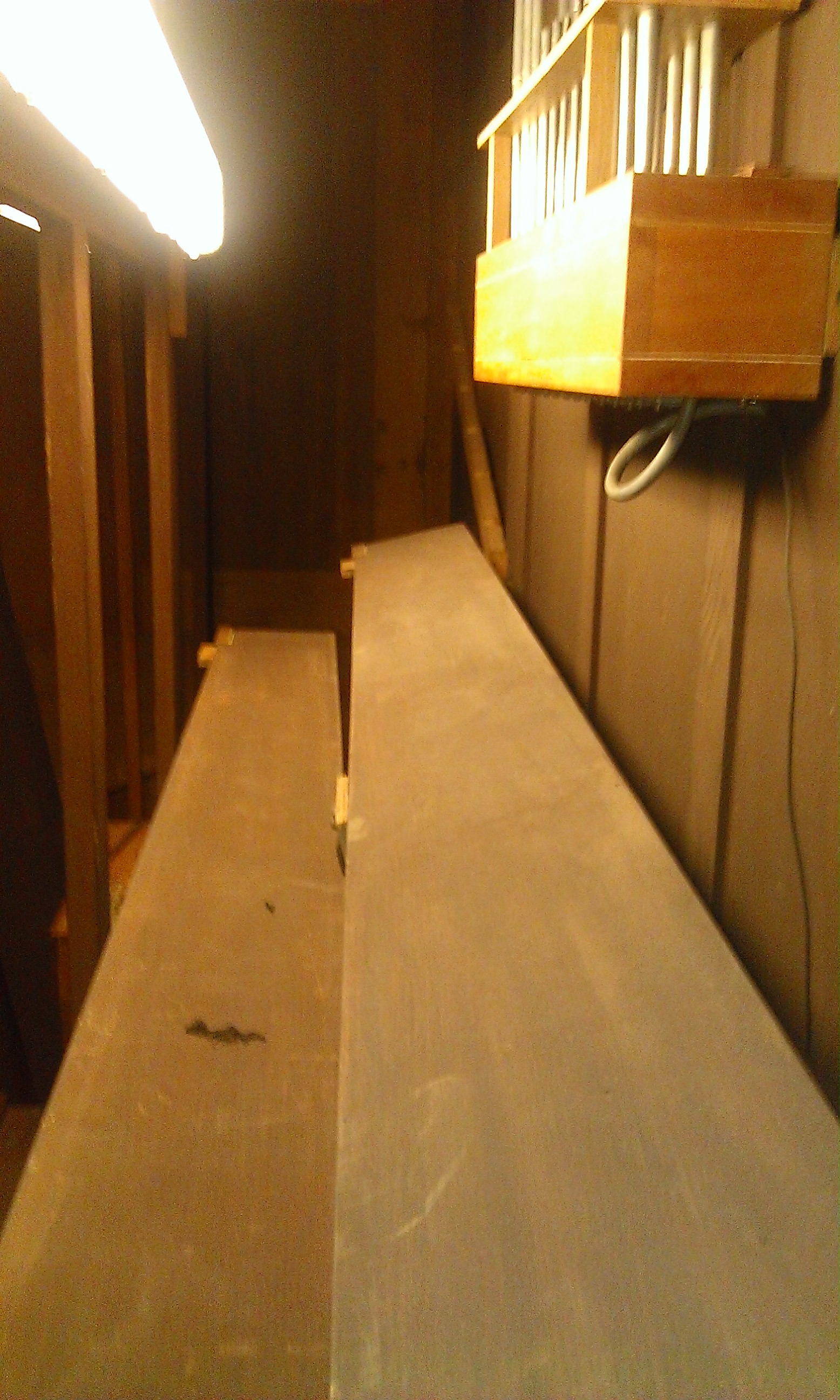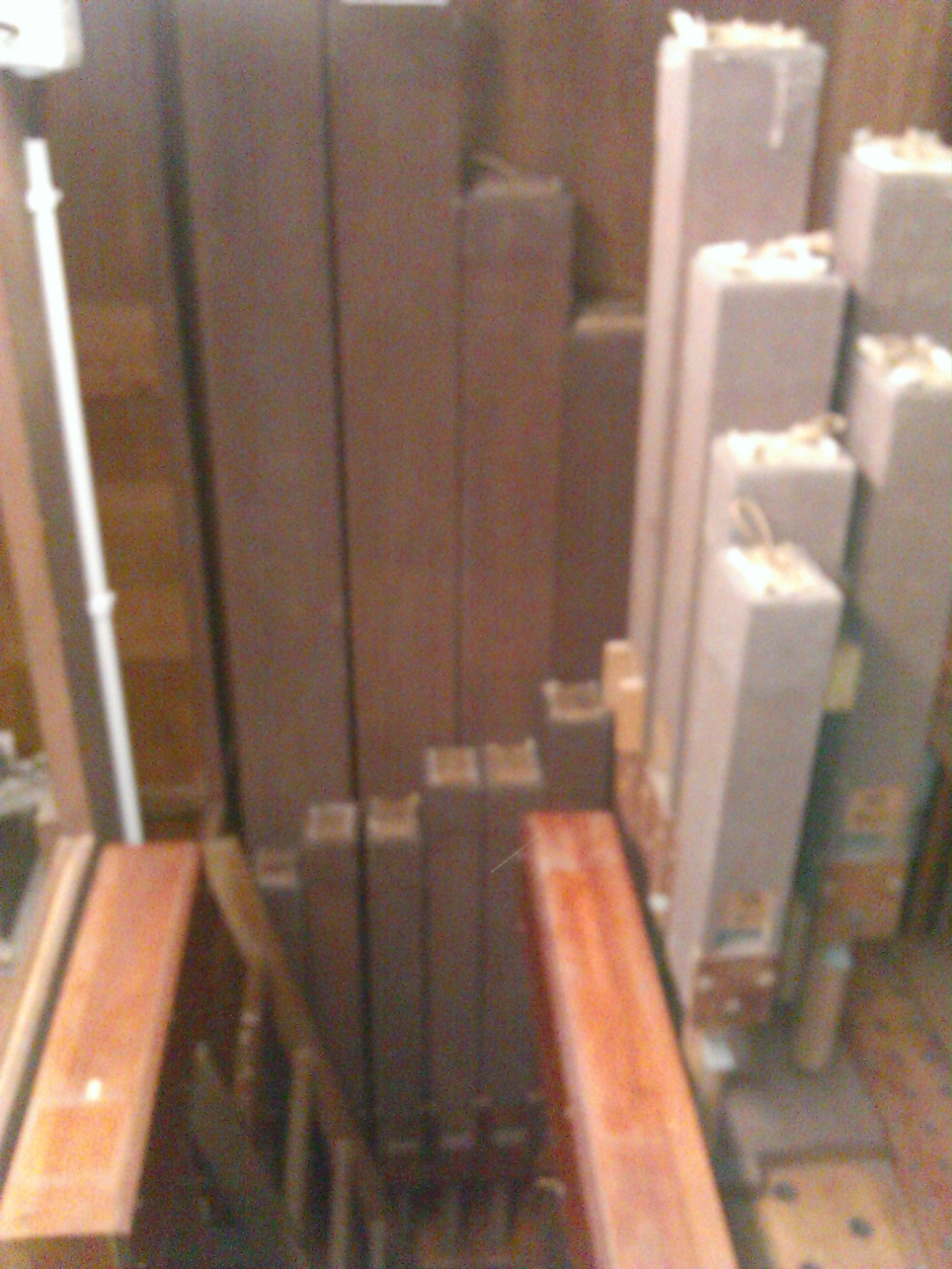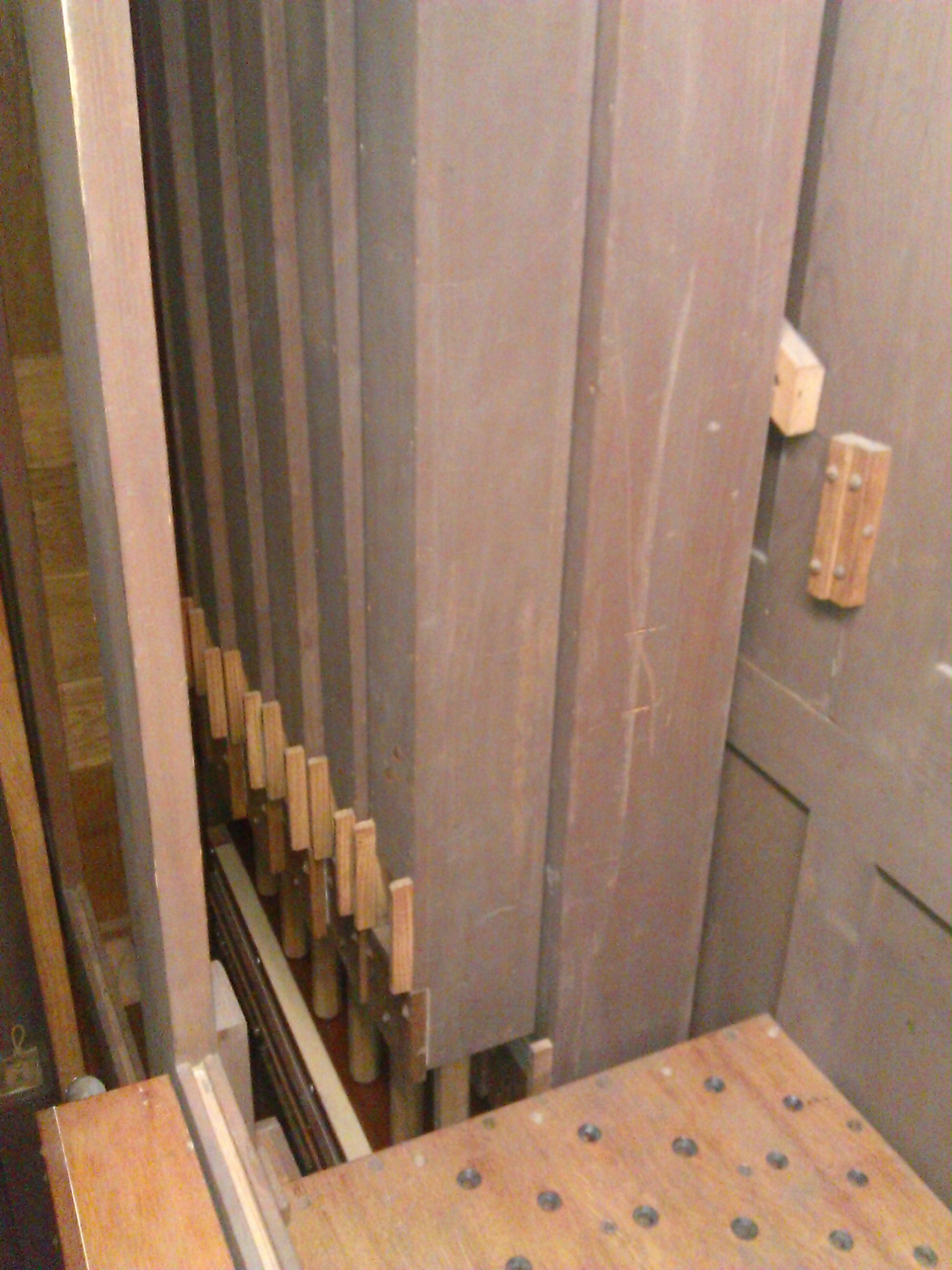 Les tuyaux de bois du grand Orgue et du Récit sont de retour dans le buffet après un bon nettoyage.