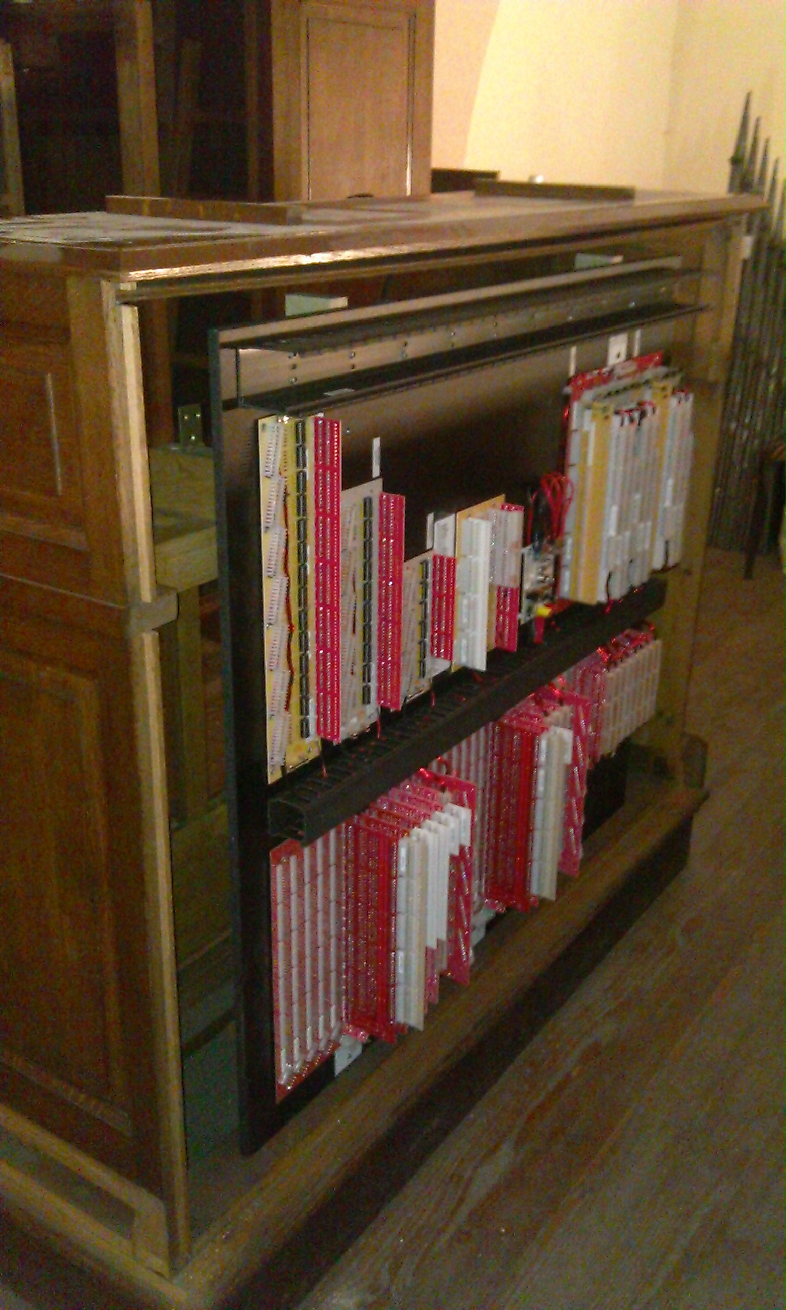 Tous les tuyaux sont maintenant dans le buffet. La console a retrouvé ses claviers mais également ses dominos de commande de registre.