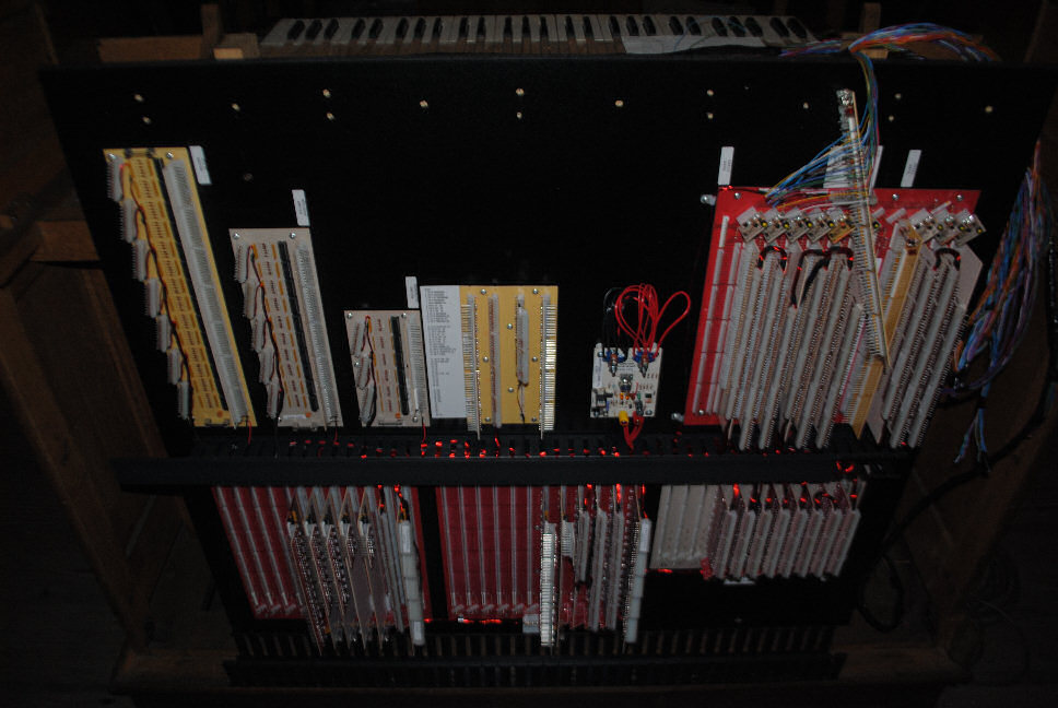 Cette carte, appelée Solid-State a été réalisée aux Etats-Unis spécifiquement pour l’orgue d’Arche. La console étant trop peu profonde pour abriter ce nouvel élément, il a fallu rallonger le meuble.