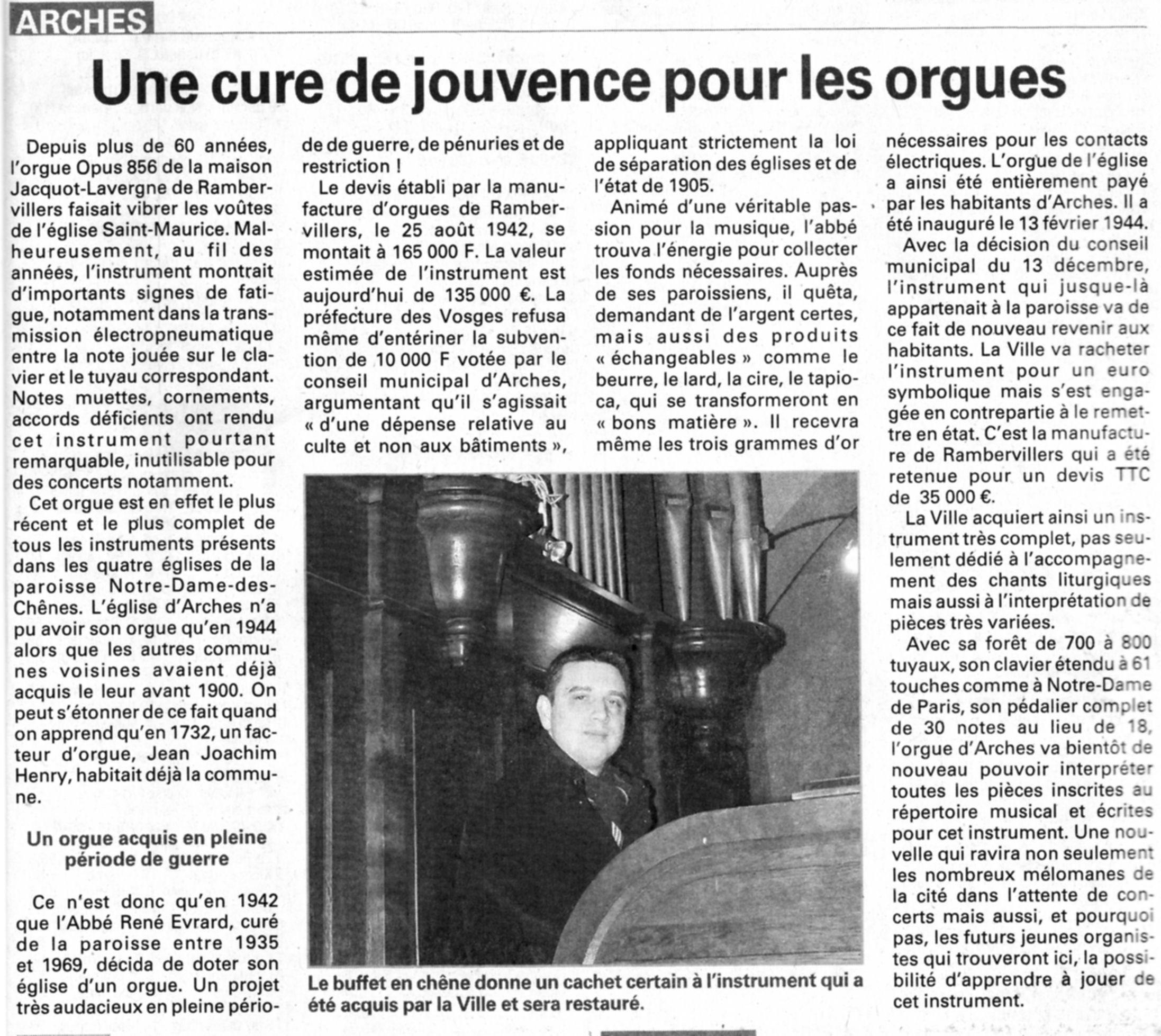 C’est un événement que les paroissiens, musiciens et mélomanes attendaient… Depuis de nombreuses années, l’orgue d’Arches montrent des signes de faiblesse et ne permet plus d’assurer dignement son rôle dans l’accompagnement et l’animation liturgique. Heureusement, la commune d’Arches vient de voler à son secours.