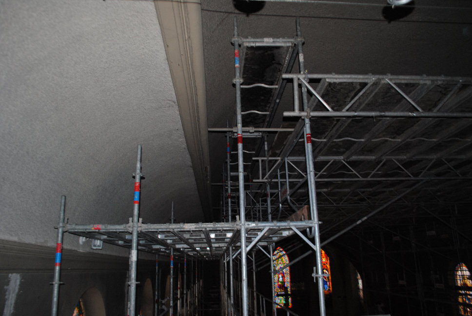 Ne soyez pas surpris par des bruits métalliques en provenance de l’église de Pouxeux. Rien de plus normal, puisque l’entreprise chargée d’installer les échafaudages bien utiles aux peintres est à l’œuvre. Le sol est totalement recouvert d’un "duvet" protecteur, ainsi que les bancs. (Cliquez sur les photos pour les agrandir)