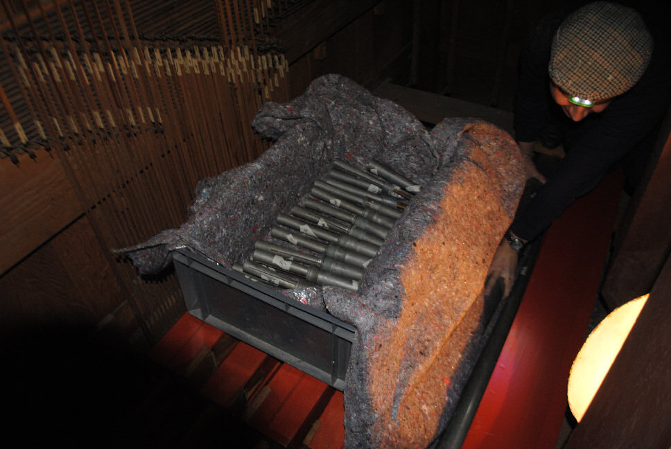 - Les tuyaux de 16 pieds, les plus grands de l’orgue, entreposés dans le buffet. Certains mesurent presque 3 m de haut.